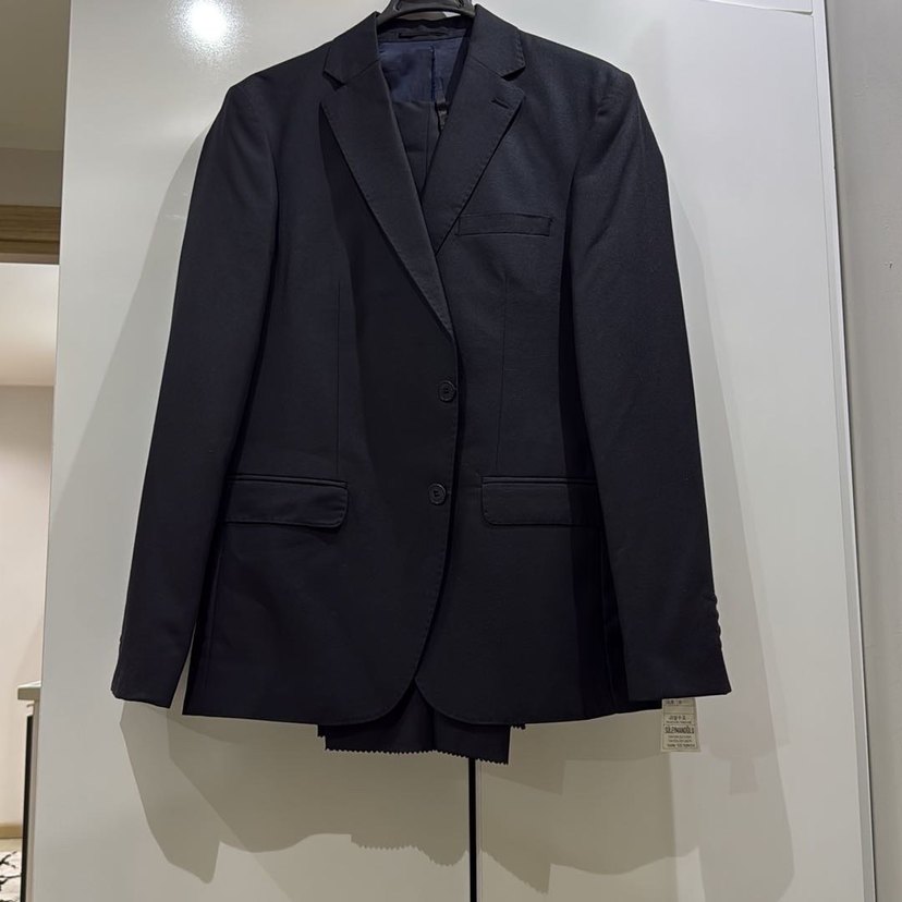 Lacivert renkli, düğmeli ve uzun kollu erkek takım elbise ceketi. Ofis ve iş ortamları için klasik ve modern tarzda, normal boyda ve sade desensiz. 50-6Drop hiç kullanılmamış ,takım elbise kılıfında sadece düğmelerinde amblem baskı olduğu için düğmeleri değiştirilecektir