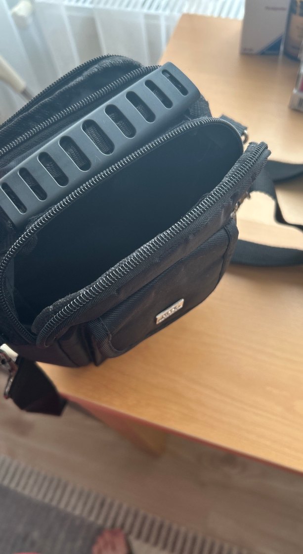 Tokalı ayarlanabilir askılı siyah erkek omuz çantası, çoklu fermuarlı bölmelere sahip. İş veya sokak tarzı için sade ve kullanışlı. Hiçbir kusuru yoktur iki kez kullanılmıştır