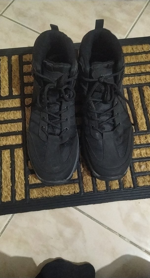 Siyah erkek outdoor botları, velcro ve bağcıklı kapanışa sahip. Dayanıklı kauçuk malzemeden yapılmış, sokak ve athleisure tarzına uygun. Outdoor aktiviteler için rahat.