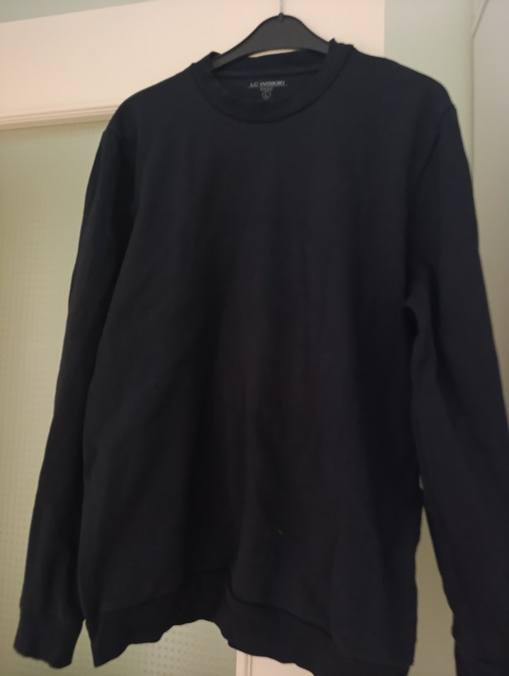 Siyah, uzun kollu, yuvarlak yakalı, oversize kesim sweatshirt. Yumuşak ve sıcak dokusu ile rahat sokak stili için uygundur.