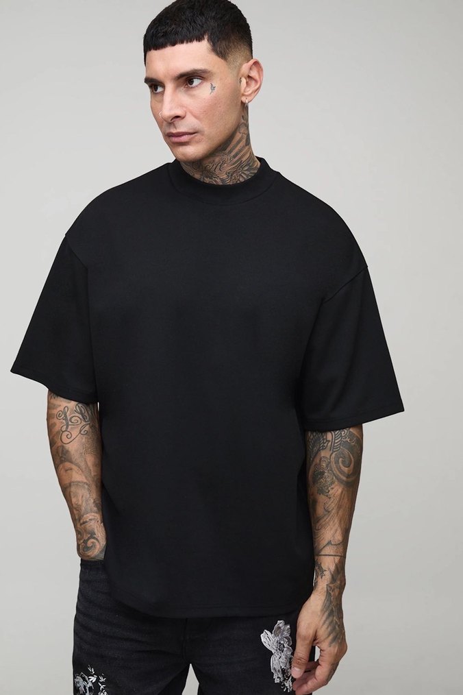 BoohooMAN marka Siyah renkli, yuvarlak yakalı ve kısa kollu, oversize kesime sahip erkek tişörtü. Desensiz ve günlük sokak stili için uygun.