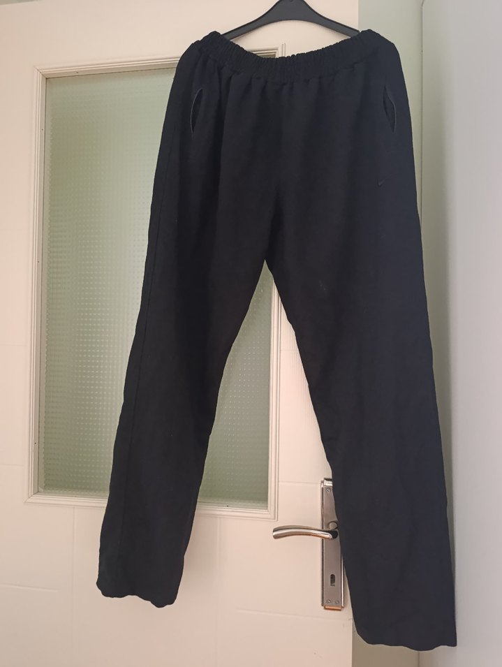 Siyah keten kumaştan, salaş kesim ve midi boyda kadın pantolon. Günlük kullanıma uygun, sade ve şık bir görünüme sahiptir.