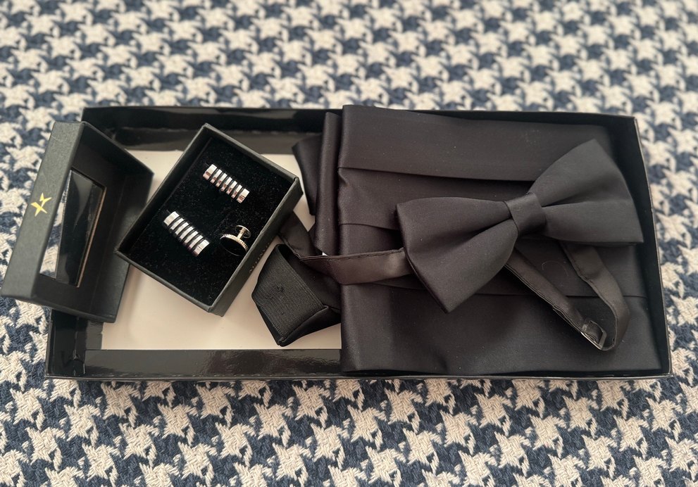 Klasik tasarımlı siyah erkek papyonu, uyumlu kol düğmeleriyle birlikte. Yumuşak kumaş ve koyu ton sofistike bir görünüm sağlar. Sadece 1 kez kullanıldı tertemiz. İhtiyaç fazlasıdır. Takım elbisesi de duruyor isteyen olursa onun hakkında da bilgi verilip birlikte satışa da sunulabilir.