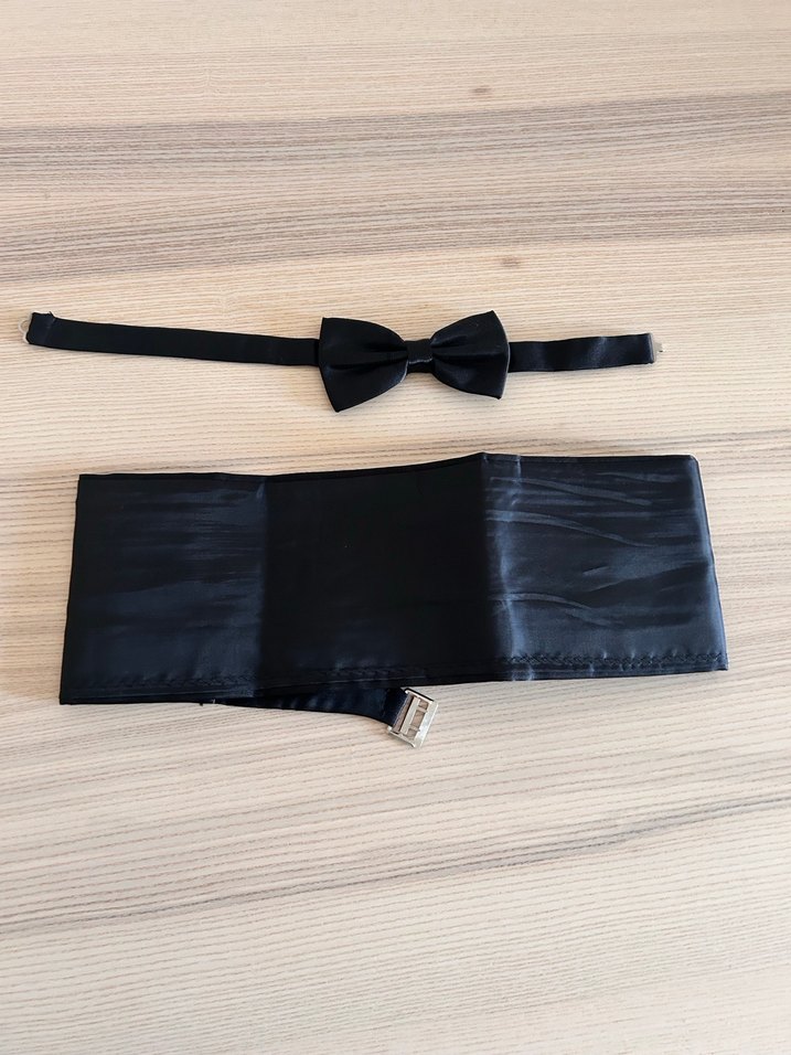 Siyah erkek papyon ve kuşak seti, düz ve pürüzsüz dokulu. Goth tarzına uygun klasik bir görünüm sunar.