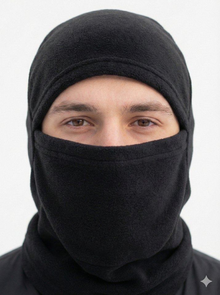 Siyah renkli, başı ve alt yüzü örten, yumuşak ve sıcak tutan kumaştan yapılmış erkek polar kar maskesi