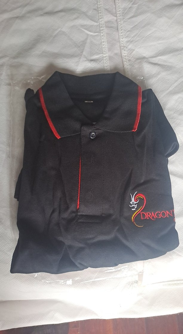 Siyah, kısa kollu, yakalı ve baskılı ejderha desenli erkek polo tişört. Kırmızı detaylar ve sportif tasarım. Günlük kullanım için uygun.