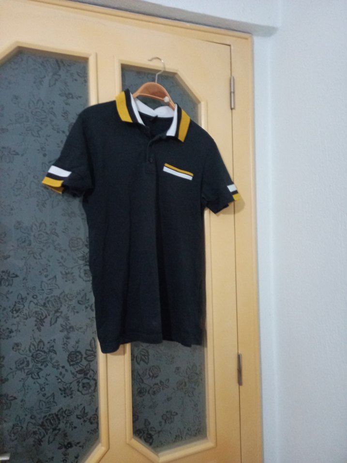 Kısa kollu, yakalı siyah erkek polo tişört. Velcro detayları ve baskılı desenleriyle trend bir günlük stil sunar. Sentetik kumaştan üretilmiştir. iki koltuk arası 47 cm boyu 69 cm . Penye.Üründe çok hafif renk açılması ve önünde çok hafif lekesi ve çok küçük bir deliği var son resimde gösterildi