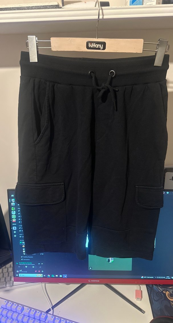 Siyah, yumuşak ve sıcak kumaştan, rahat kesim midi erkek bermuda, kemerli ve cepli, açık hava için uygun.