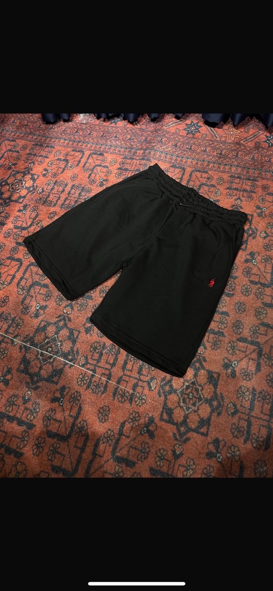 Yumuşak ve sıcak kumaştan yapılmış, elastik bel bantlı siyah rahat kesim erkek mini şort, küçük kırmızı logolu. Spor tarzı için uygun.