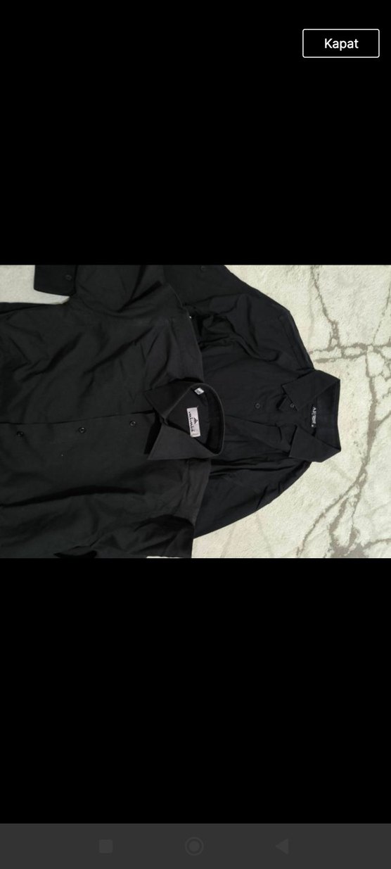 Siyah uzun kollu erkek gömlek, yakalı ve düğmeli ön kısmı ile. Sentetik kumaştan, regular fit kesim, ofis kullanımı için uygun. Minimalist ve desensiz tasarım.