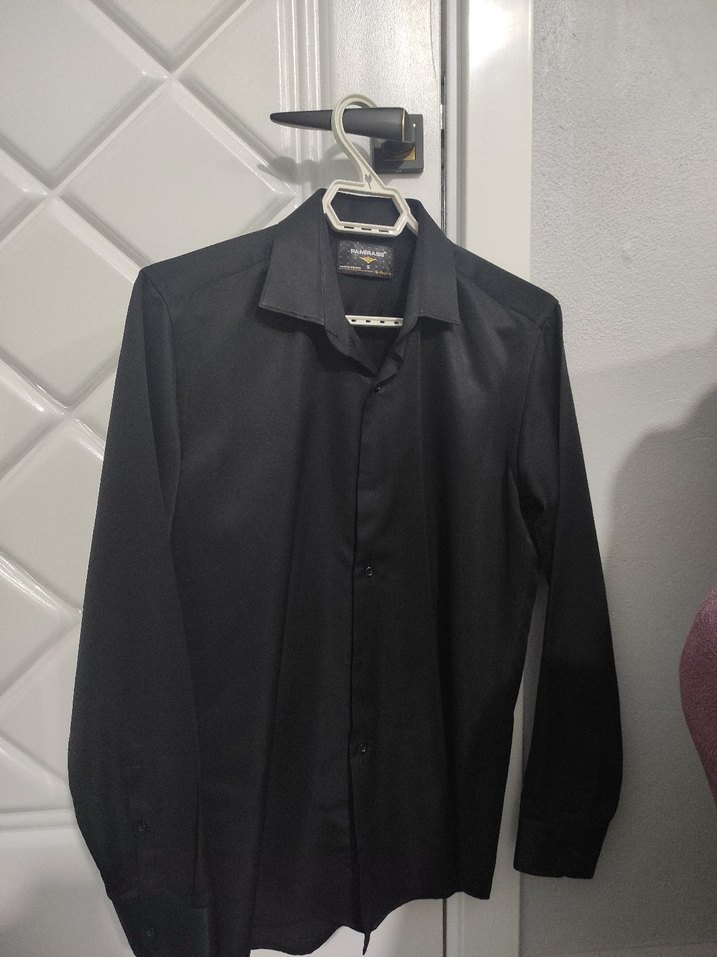 sadece bir kez giyildi yepyenidir .Siyah renkli, notched lapel yakalı, regular fit kesim, uzun kollu ve düğmeli manşetlere sahip erkek gömleği. Ofis kullanımı için uygun, düz ve sentetik kumaştan yapılmıştır.