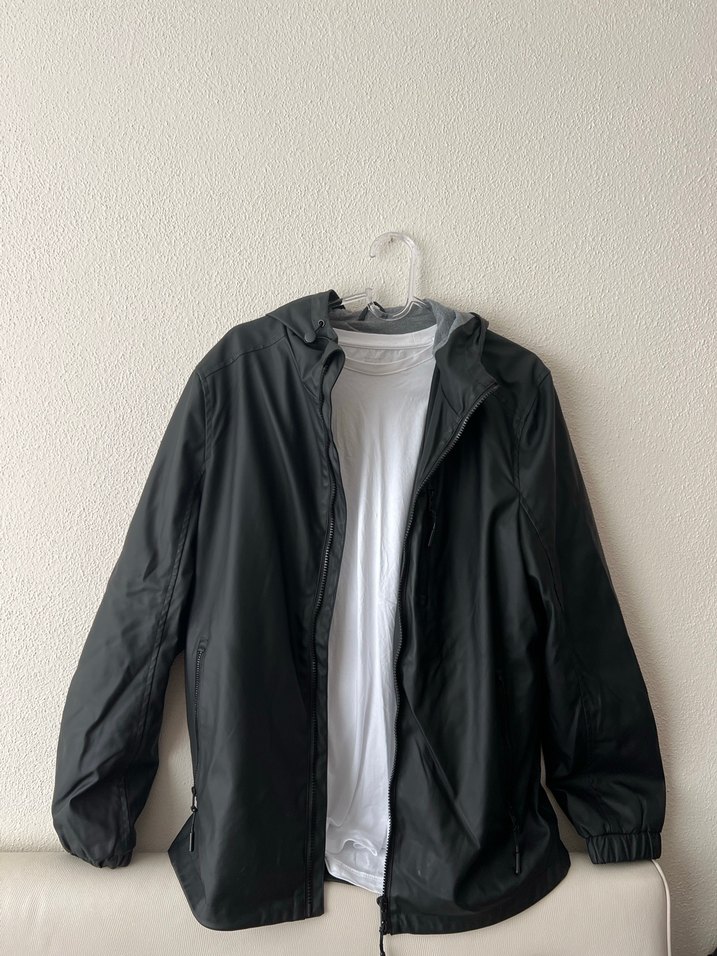 Siyah erkek rüzgarlık, bol kesim ve yuvarlak yaka, günlük kullanım için rahat ve şık.