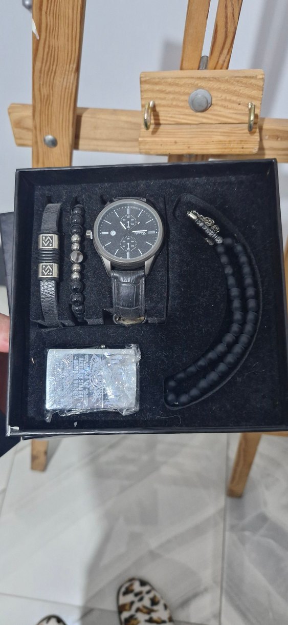 Siyah deri kayışlı erkek saat ve uyumlu siyah boncuklu bilekliklerden oluşan iş stiline uygun set. ⌚