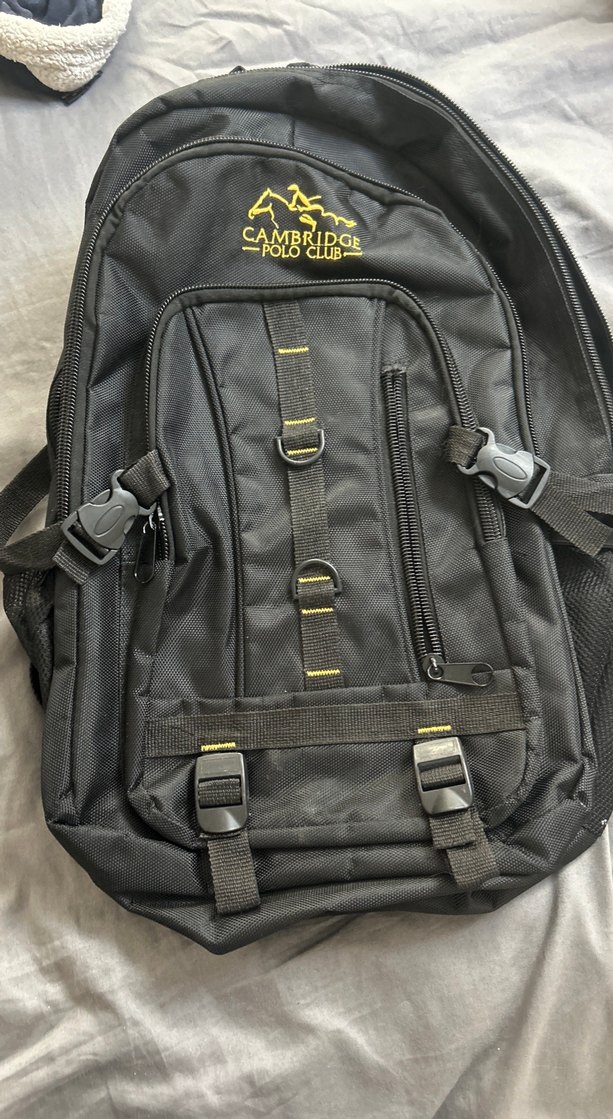 Tokalı kayışlara ve baskılı tasarıma sahip siyah erkek sırt çantası. Çoklu bölmeleri ve 'Cambridge Polo Club' logosu bulunur. Street style için uygun.