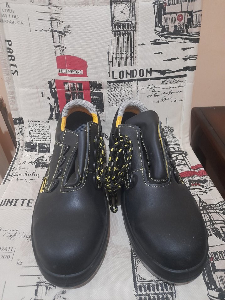 Siyah renkli, sarı detaylı, Velcro kapamalı erkek sokak stili botları. Üzerinde "NITE" ve "LONDO" yazılı baskılar bulunur. erkek iş ayakkabısı