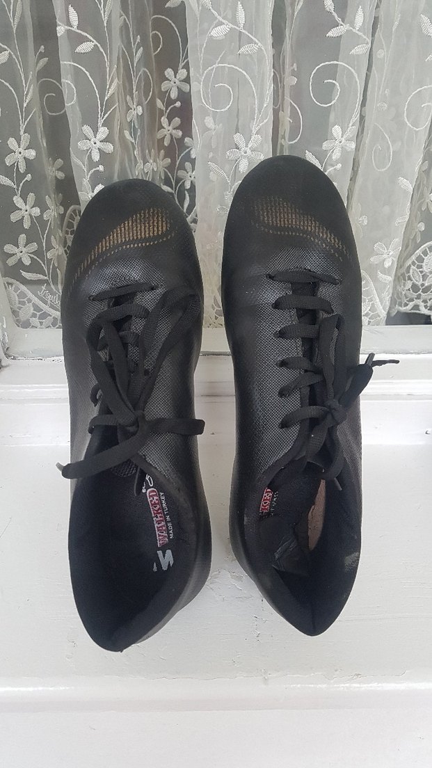 Siyah bağcıklarıyla erkek spor ayakkabıları, koyu goth tarzıyla uyumlu ve nefes alabilir tasarıma sahip. krampon 40 numaralı