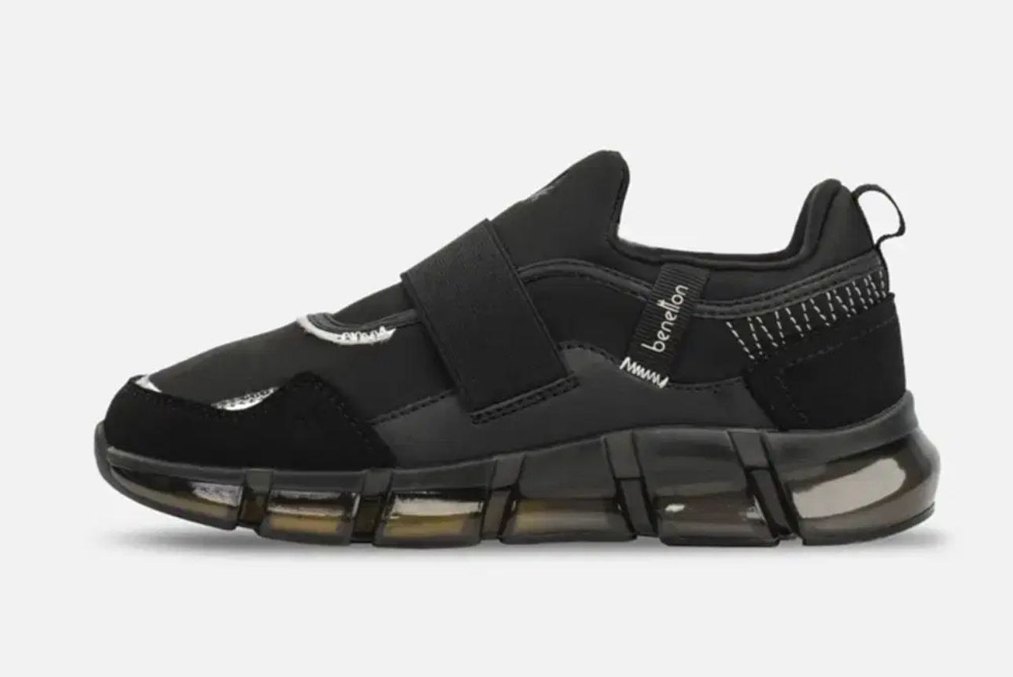 Siyah renkli erkek spor ayakkabısı, velcro bant ve baskılı detaylara sahiptir. Kauçuk taban, spor ve günlük kullanıma uygundur.