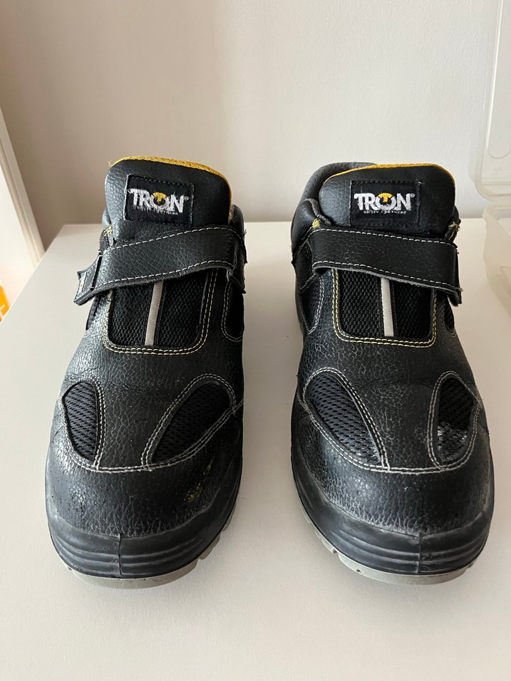 Siyah erkek spor ayakkabılar, kauçuk tabanlı ve Velcro bantlı, baskılı detaylarla ve TRON markasıyla sokak stiline uygun.ön kısımda koruyucu metal detay vardır iş ayakkabısı olarak kullanılır.