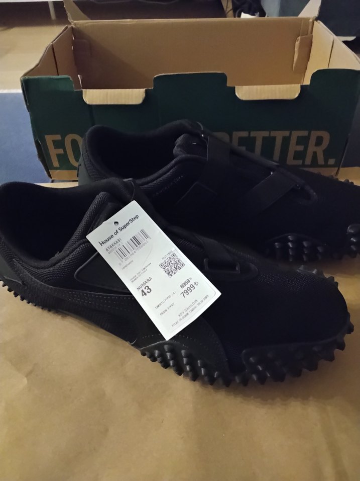 Siyah erkek spor ayakkabısı, kauçuk tabanlı ve Velcro bantlı, baskılı desene sahip. Sokak stili ve spor için uygun, modaya uygun athleisure görünüm sağlar. Puma Mostro orjinal küçük geldiği iade süreci geçtiği için satmak zorunda kalındı.