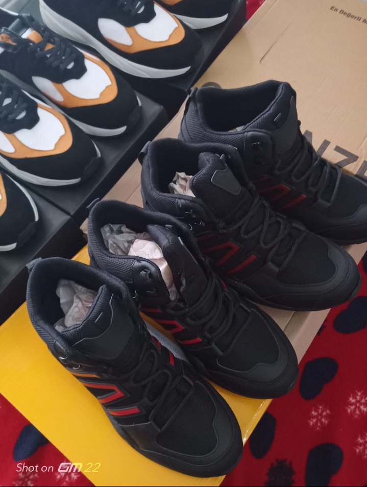 Siyah, baskılı desenli erkek spor ayakkabısı, Velcro kapamalı ve dayanıklı kauçuk malzemeden üretilmiştir. Trendy casual ve spor için uygundur.