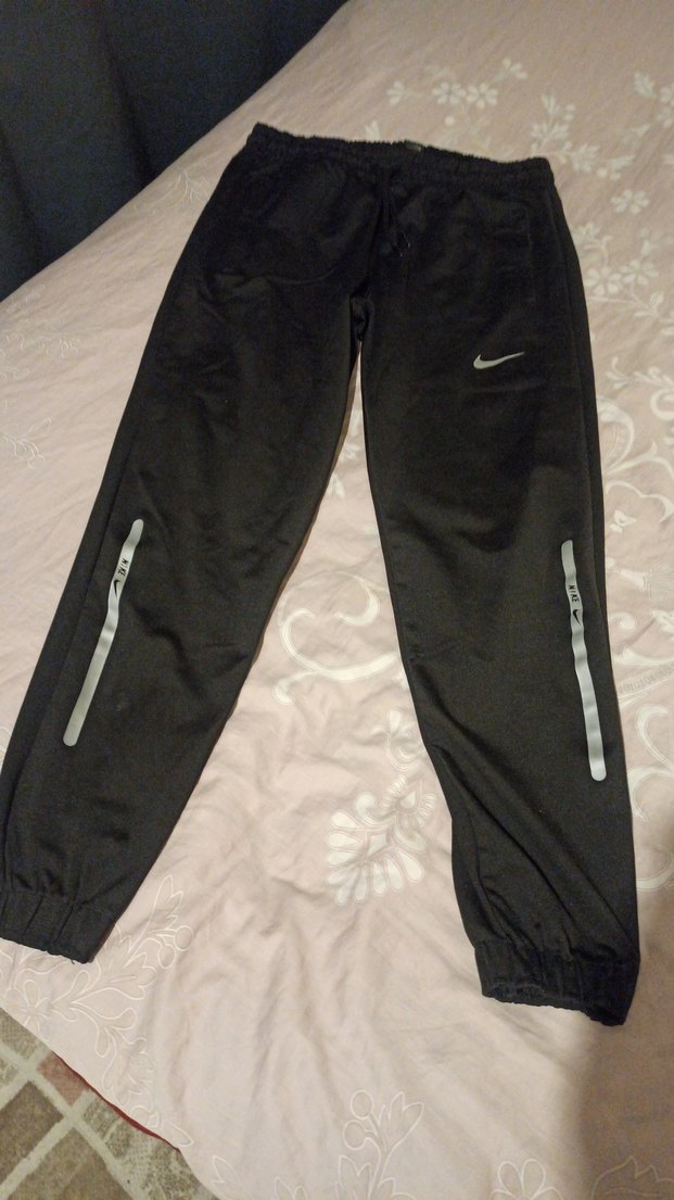 Siyah, dar kesim erkek eşofman altı, yırtmaç ve reflektör detaylı, sentetik kumaştan spor ve günlük kullanım için uygun. ♂️ tertemiz sorunsuz .