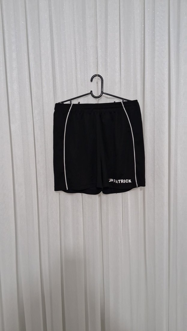 Siyah, elastik bel bantlı, beyaz şerit detaylı ve PPatrick marka yazılı, sentetik kumaştan yapılmış erkek spor mini şort. Sokak stili ve spor için uygun. ♂️