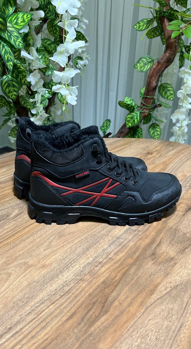 Siyah renkli, bağcıklı ve baskılı desenli erkek outdoor botları, yumuşak astarlı ve spor ile günlük rahat sokak stili için uygundur.