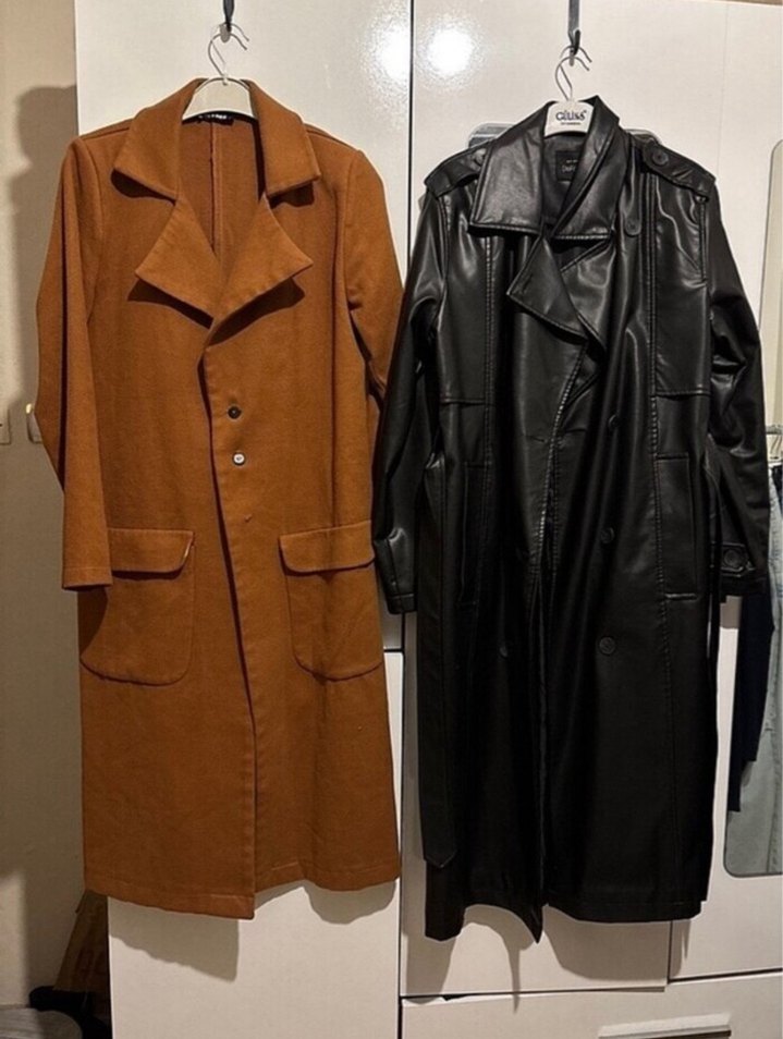 Kadın kahverengi deri uzun trençkot, yakalı ve düğmeli. Sokak stili için düzenli kesim ve uzun kollu, günlük kullanıma uygun koyu renkte ve desensiz. İkili fiyattır detaylar için dolabımda bulunmakta ayrı ayrı olarak da alabilirsiniz mevcuttur. Fiyat sondur!!!!