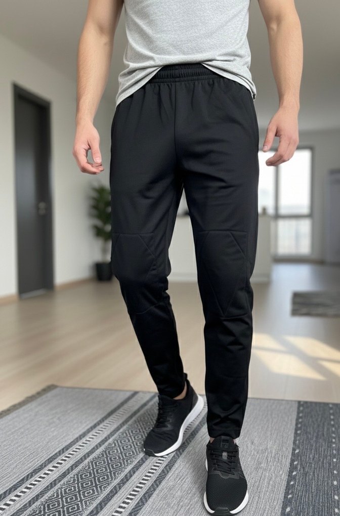 Siyah, sentetik kumaştan, bağcıklı ve rahat kesim erkek spor eşofmanı. Spor ve gündelik için uygundur kaliteli kumaşı dizleri konforlu hafif sünger var gibi ve yan kısımları çok rahat 1 kez giyildi