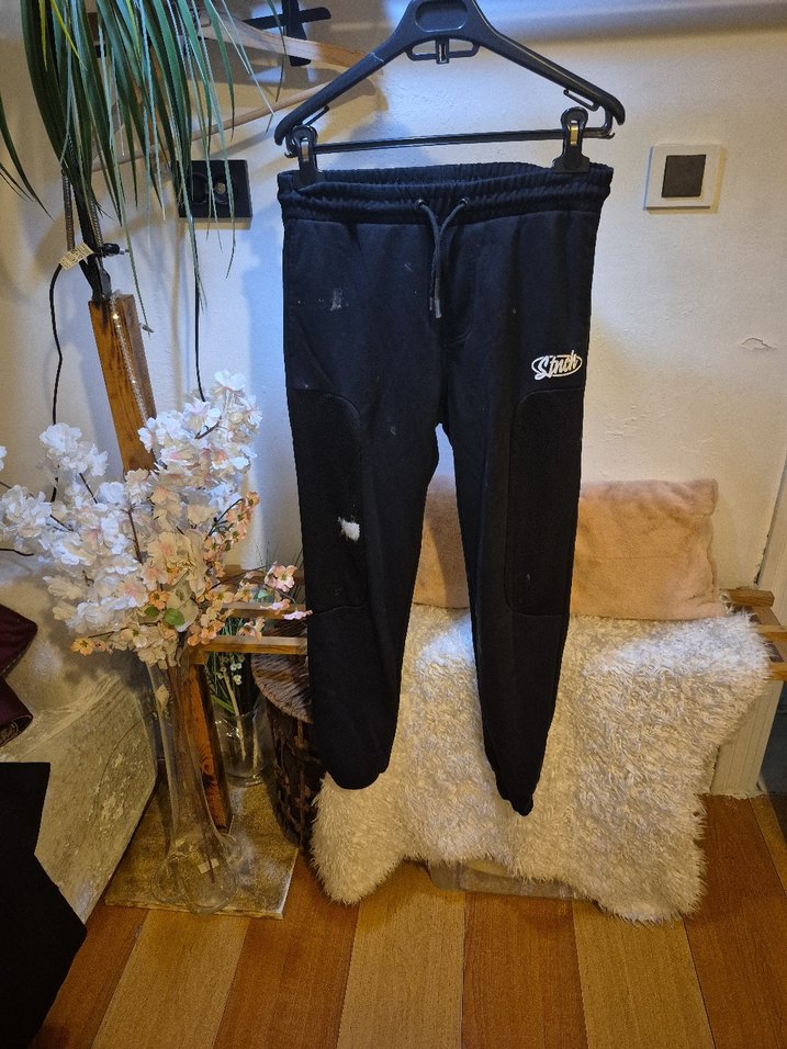Yumuşak ve sıcak kumaştan yapılmış, orta boy bacaklı, rahat kesim siyah erkek eşofman. Spor ve günlük kullanım için uygun, cırt cırtlı detaylar içerir.