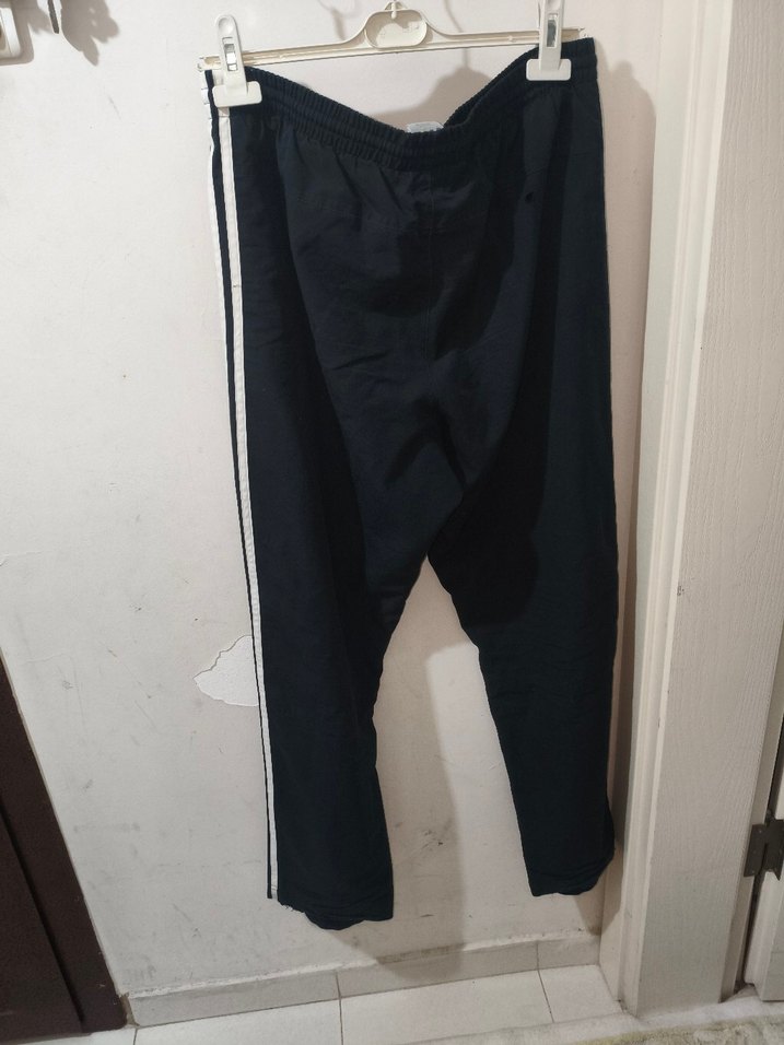 Siyah renkli, yan çizgili ve yırtmaç detaylı, sentetik kumaştan üretilmiş rahat kesim erkek spor pantolonu.