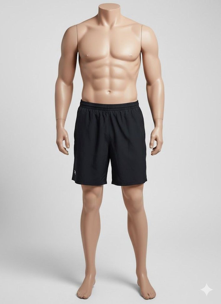 Düz siyah, mini kesim, vücuda oturan erkek spor şortu. Pürüzsüz sentetik kumaştan, cesur ve normcore athleisure tarzında. ♂️
