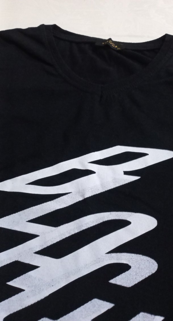 Siyah erkek tişörtü, beyaz büyük baskı ile sade ve temel tarzda. Rahat ve günlük kullanıma uygun. Black yazıyor