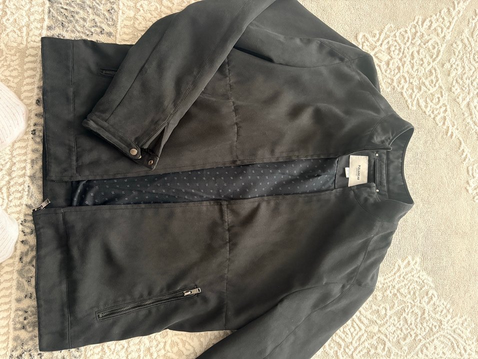 Siyah süet erkekceket , çıtçıtlı manşet ve fermuarlı ön detaylıdır. uzun kollu ve ofis için uygundur.