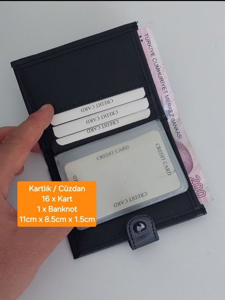 16 kart ve 1 banknotluk siyah erkek suni deri cüzdan. Ölçüler: 11cm x 8.5cm x 1.5cm. İş hayatına uygun.