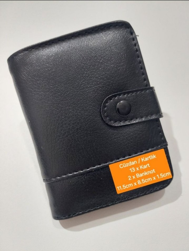 Siyah renkli, baskılı ve çıtçıtlı erkek suni deri cüzdan. 13 kart ve 2 banknot alır, ölçüleri 11.5cm x 8.5cm x 1.5cm.