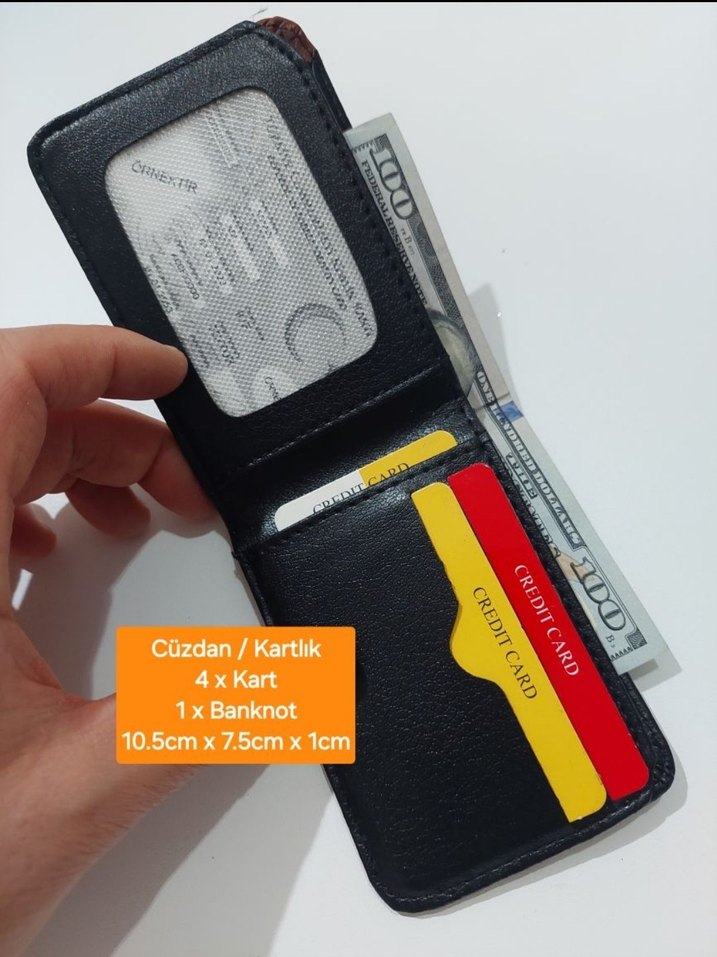 Siyah baskılı erkek cüzdanı, 1 banknot ve 4 kart alabilir. Boyutları 10,5 x 7,5 x 1 cm, sokak tarzına uygun.