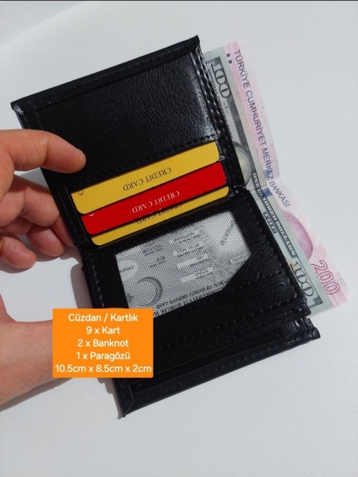 10.5cm x 8.5cm x 2cm ölçülerinde, 9 kart, 2 banknot ve 1 para gözü bulunan siyah baskılı erkek suni deri cüzdan. Basit ve kullanışlı.