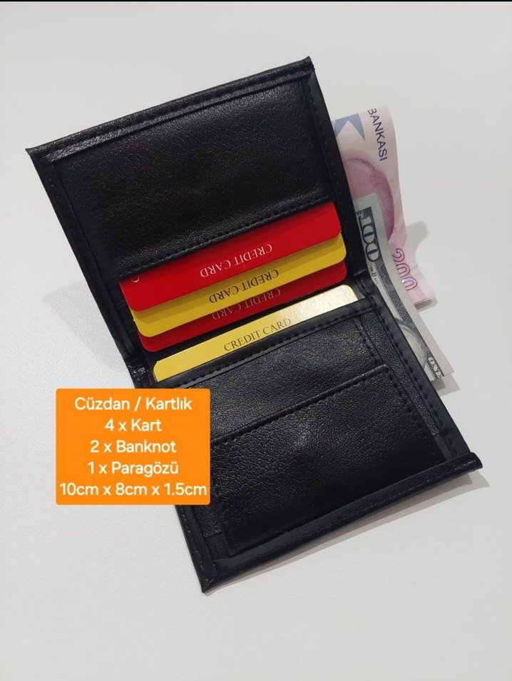 Siyah erkek cüzdanı 4 kartlık, 2 banknot bölmeli ve 1 paragozlu. Ölçüleri 10x8x1.5 cm, iş için uygun.