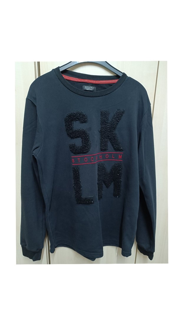 Siyah renkli, uzun kollu, yuvarlak yaka erkek sweatshirt. Sentetik kumaştan, bol kesim ve triko dokulu, "SK" ve "Stockholm" baskılı desenlere sahip. Trend sokak stili için uygun.