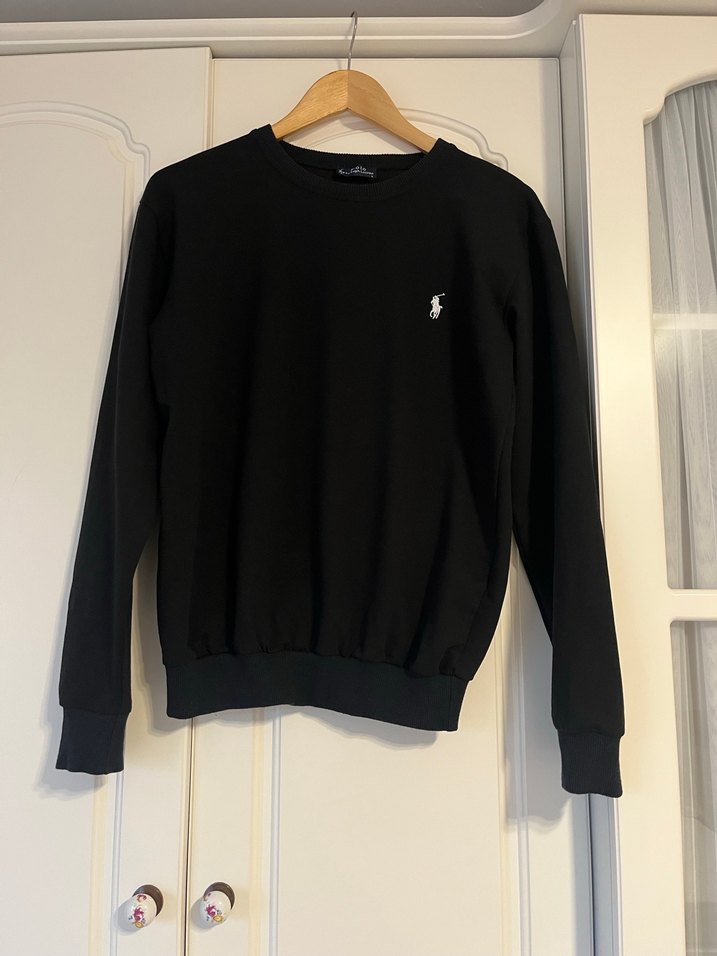 Uzun kollu, bisiklet yaka siyah erkek sweatshirt, bol kesim ve yumuşak sıcak kumaş. Minimalist, desensiz tasarım, rahat sokak stili için.
