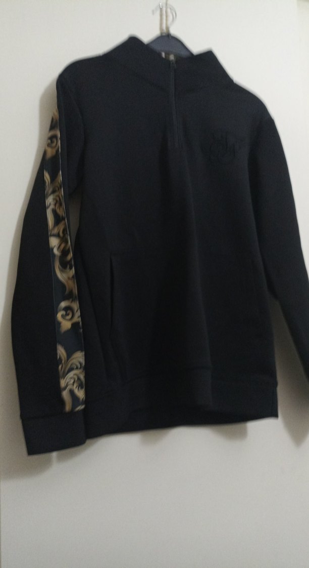 Yarım fermuarlı, yüksek yakalı siyah erkek sweatshirt. Tek kolda desenli şerit ve bol kesim ile sokak stiline uygun.