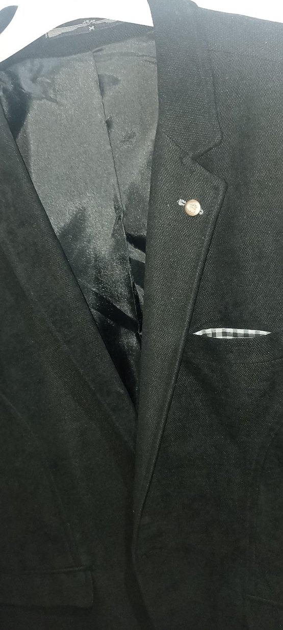 Siyah renk, notch yaka ve düğmeli kapamalı erkek takımıdır. Parlak dokusu, klasik streetwear tarzı ve strappy kollara sahiptir, ofis kullanımı için uygundur. ️