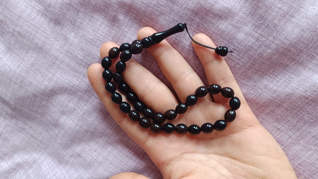 siyah renkli, parlak ve geleneksel minimal tasarımlı erkek tesbih. Günlük kullanıma uygun.