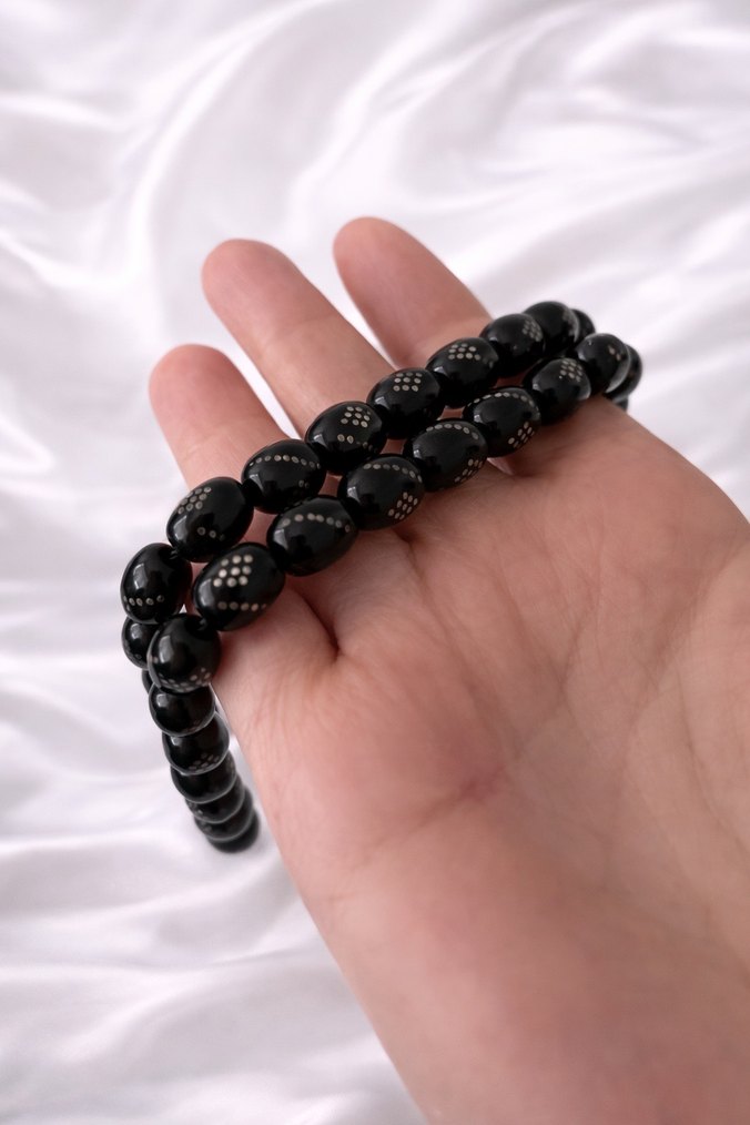Şık ve ağır duruşuyla öne çıkan erkek işlemeli tesbih. Siyah zemin üzerine ince nokta işlemeleriyle oldukça zarif ve karakterli bir görünüme sahiptir. Elde çekimi rahat, dengeli ve tok bir hissiyat verir. Günlük kullanımın yanı sıra koleksiyonluk olarak da değerlendirilebilir. İşlemeli taneler Erkek tesbih modeli Kullanıma hazır, genel durumu iyi Fotoğraflar ürüne aittir Taş hakkında: Görünüm ve parlaklığına bakılırsa oniks (siyah akik) ya da onikse benzer doğal bir taş olması muhtemel. Kesin taş bilgisi iddia edilmeden, görsel ve dokusal özelliklere göre bu şekilde değerlendiriyorum. Net bir şey söyleyemeyeceğim. Sorularınız olursa memnuniyetle yanıtlarım. Hızlı gönderim yapılır