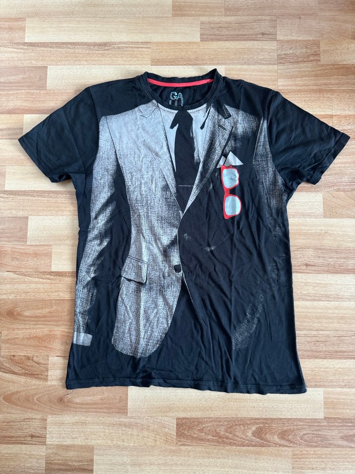 siyah erkek tişört, takım elbise görünümlü yaka baskılı, sentetik kumaştan. Normal kesim, kısa kollu, ofis kullanımı için uygundur. Minik dikiş var