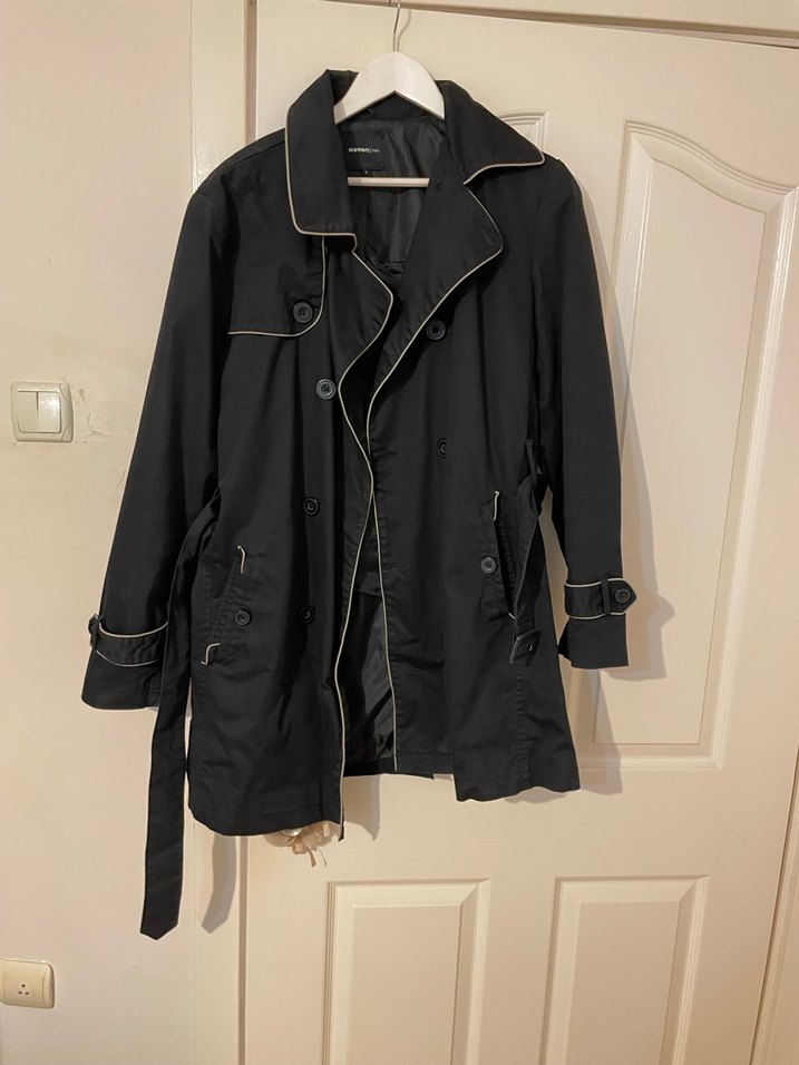 Siyah bol kesim ve kemerli Erkek trençkot. Çentikli yaka ve uzun kollu, sentetik kumaştan günlük kullanım için uygun.