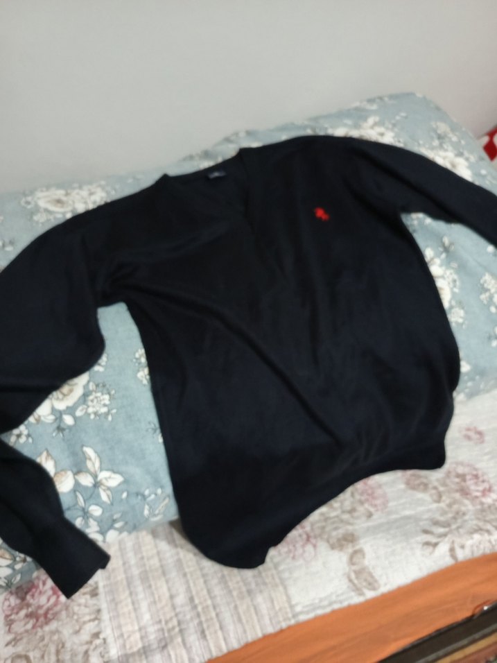 Siyah, uzun kollu, bisiklet yaka ve rahat kesime sahip erkek triko sweatshirt. Yumuşak örme kumaştan, gündelik ve sokak stiline uygun.