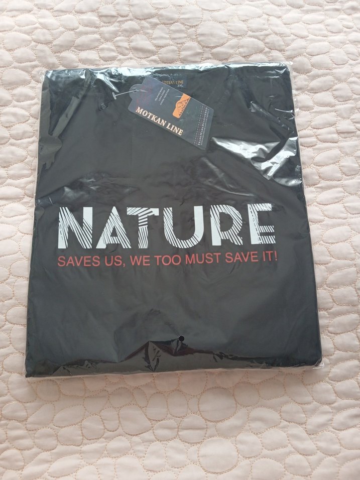 Çevre bilincini vurgulayan "NATURE SAVES US, WE TOO MUST SAVE IT!" yazılı siyah baskılı Erkek tshirt iki kol arası 55 cm.
