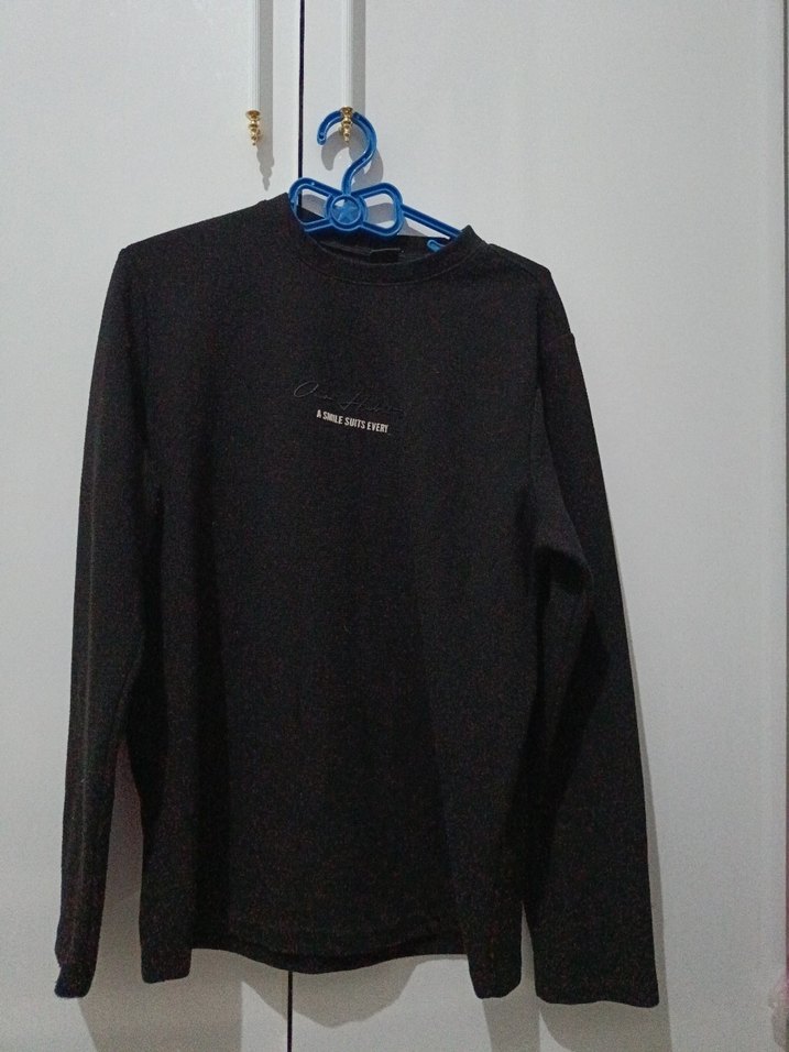 Siyah, uzun kollu, yuvarlak yaka ve bol kesim sweatshirt. Düz ve sentetik kumaştan, günlük kullanıma uygun minimalist tarz.